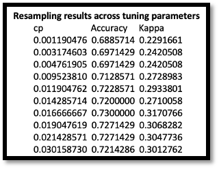 The default setting of linear kernel SVM is holding a constant of cost = 1, which might not output the best optimal model. In this case, adding tuneGrid with different cost could solve the default issue. But after truning, we found that different costs will not bring better accuracy rate on train set. The optimal Cost = 0.4 with accuracy 0.5600000 on the train set, and all of the accuracy of costs are below 0.60(as shown in the figure below).