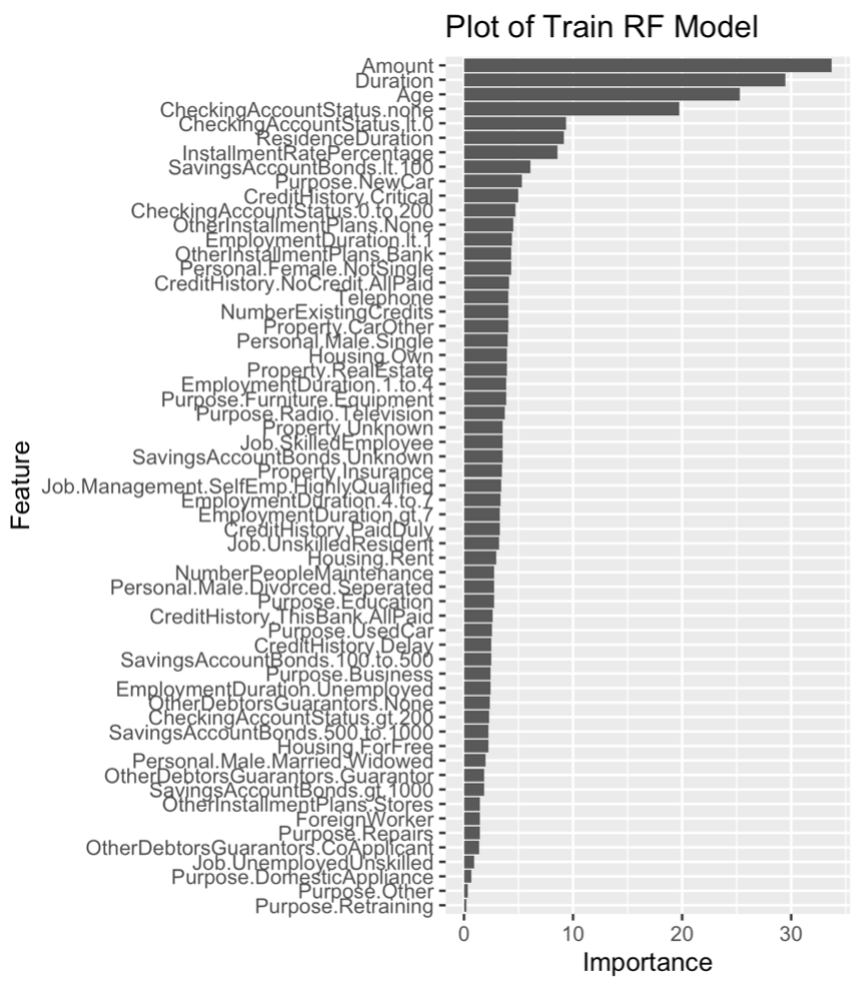 In the R script, we use scale = FALSE to prevent scaling when plotting, so that the real value can be displayed. There are two measures of importance given for each variable in the random forest: Accuracy decreases and Gini impurity decreases. From the importance measured by these two values, it can be found that Amount, Duration, Age, CheckingAccountStatus.none, CheckingAccountStatus.lt.0, and ResidenceDuration are the top five important variables in order. Compared with the five variables in the decision tree, three variables (Duration, CheckingAccountStatus.none , and Amount ) all appear in the training model, indicating that they are all important. It can also be seen that the variavles of Propose relating has no significant effect on distinguishing class.