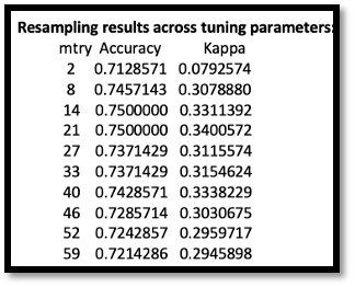 We have already known that mtry is the number of variables randomly sampled up at each split, with the output of different mtry, we could get the final value used for the train model was mtry = 14 with train set accuracy of 0.7500000. For the test dataset, the test error is equal to 1- accuracy and is equal to 0.25.