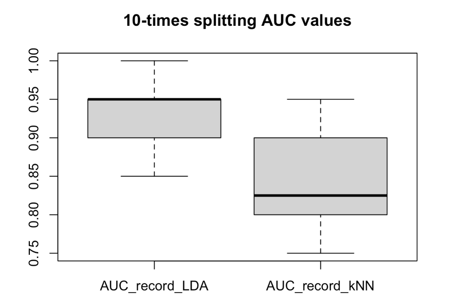 - The true classification boundary might be linear, kNN might be more flexible in non-linear separated classification. Finally, we also found that if we changed the seed, sometimes there would be obvious changes in the results. The reason may be that the number of samples is too small (the overall dataset has only 185 observations), but no matter how the random seed changes, both kNN and LDA can make the average AUC performance exceed 0.90, which means that both methods are good solutions.