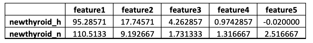 Download the newthyroid.txt data from moodle. This data contain measurements for normal patients and those with hyperthyroidism. The first variable class=n if a patient is normal and class=h if a patients suffers from hyperthyroidism. The rest variables feature1 to feature5 are some medical test measurements.
