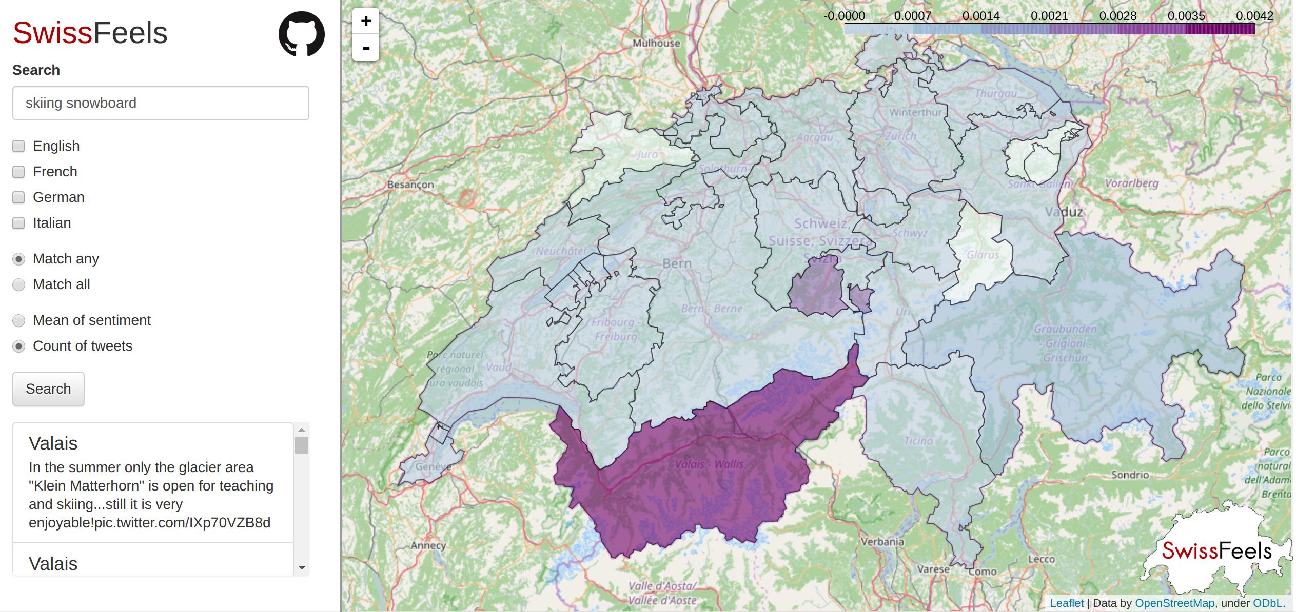 We built an interactive map of Switzerland that displays the mean sentiment of each Swiss canton. Thanks to the search function, it is possible to view the mean of a subset of tweets containing search terms such as "SBB CFF FFS". See the screenshots section for an example of mean sentiment. There's also an option to display a map of the proportion of tweets containing the search terms, as you can see in the screenshots section. Some matching tweets are displayed so that the user can verify that his/her query works well.