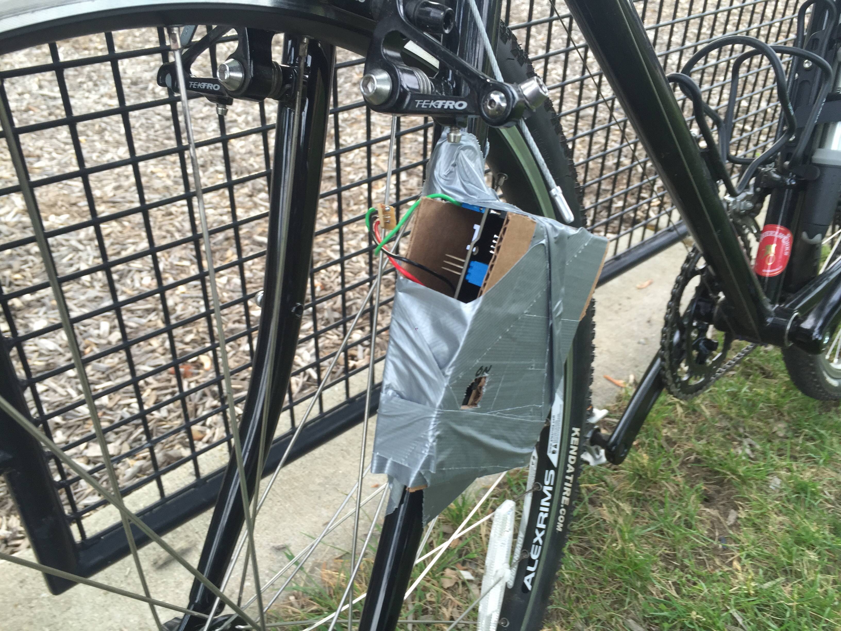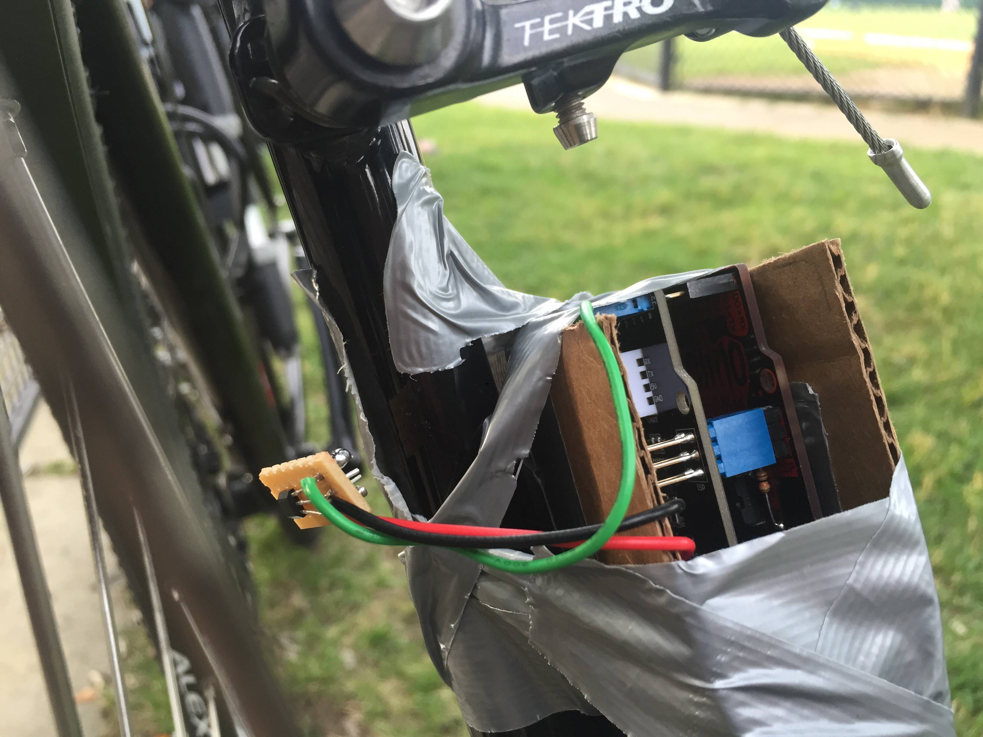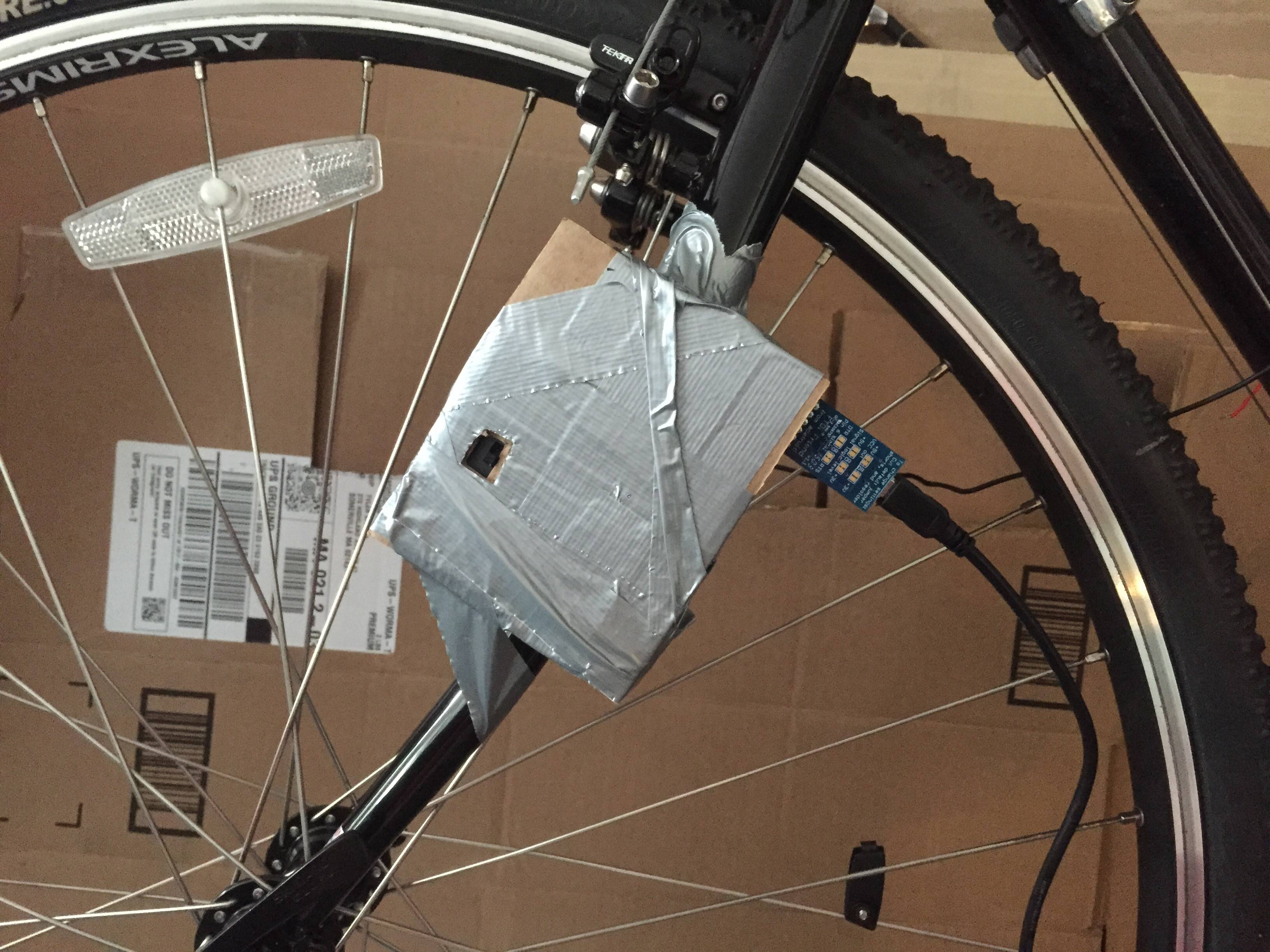 Long story short you're gonna wire up the hall effect sensor to one of the Arduino's digital pins and mount it on the bike like so.