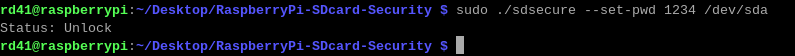 sudo ./sdsecure --unlock <Password> <device>- Remove the password of the SD card using the following command.