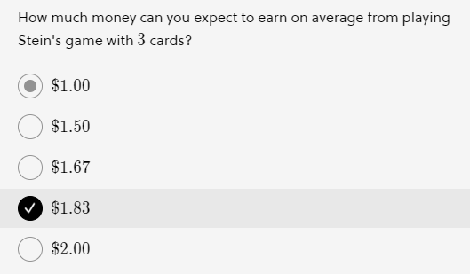 To play Stein’s game with NN cards, a dealer takes NN cards numbered 1, 2, \ldots, N1,2,…,N and shuffles them. Then, the player flips them over one by one, and they will be paid \dollar 1$1 every time a new highest card shows up. (The first card always counts as a highest card, since you haven’t seen any cards yet.)