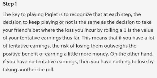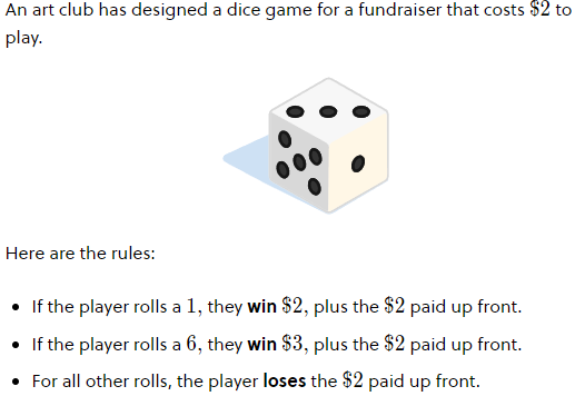 In the game of piglet, the player rolls a six-sided die and can either win or lose money depending on what they roll.
