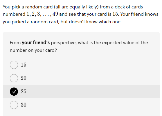 This has a significant implication: the expected value of something can be different depending on how much you know, and it can even change for the same player as they get more information.