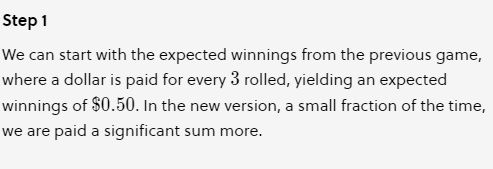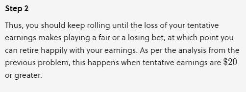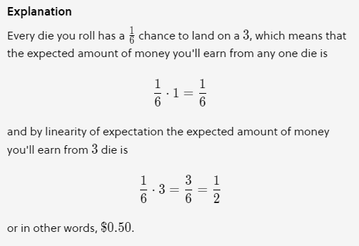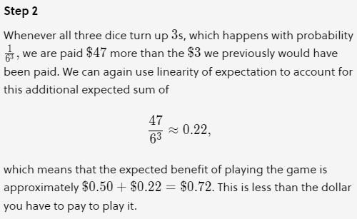 Thanks to the linearity of expectation, we can compute the expectation of a sum by adding individual expectations. This concept let us find the best strategy in a more complicated variation of the game of piglet.