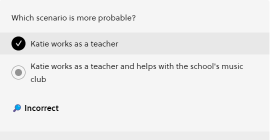 Given the answer choices, it is much more likely that Katie, despite her past history, is only one of these rather than both of these. There is some probability that Katie does not help with the school’s music club. In addition, the event that Katie is both a teacher and helps with the music club is a subset of the event that Katie is a teacher. (A subset is a set contained within another set.) Thus, it cannot be more likely than the event that Katie is a teacher.