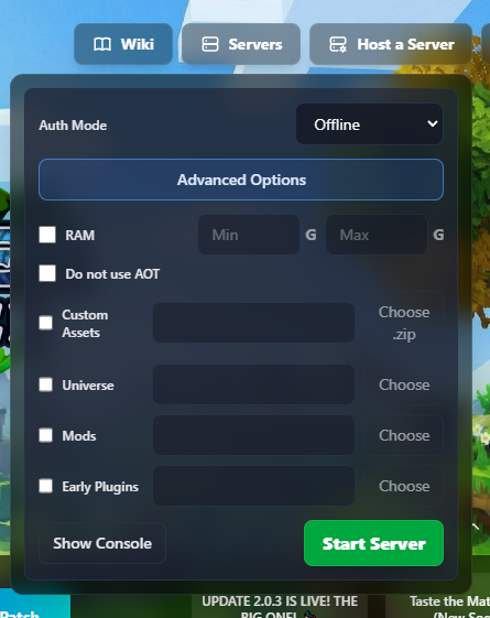 Granular Control: Select RAM usage, modify assets, swap Universes/Worlds, and install Early Plugins/Mods.