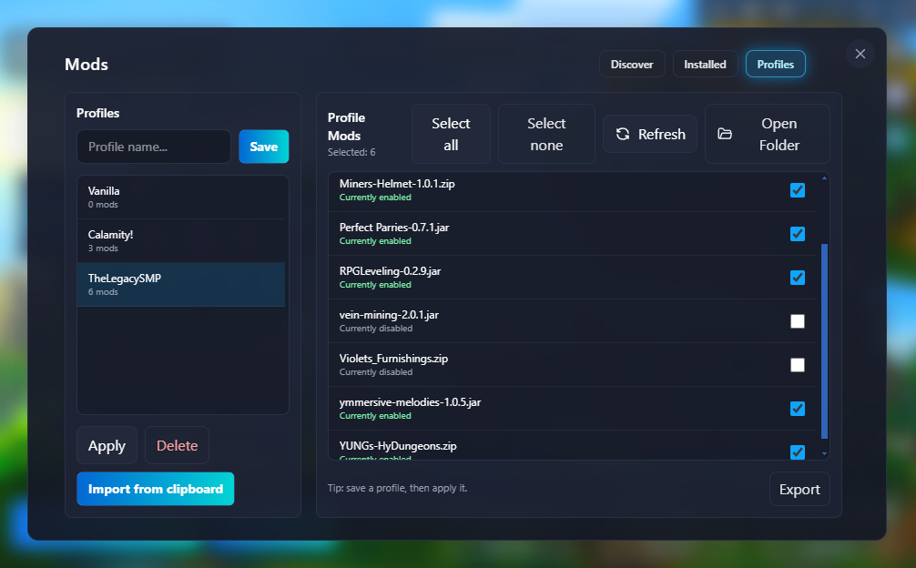 Profile Manager: Create isolated "Modpacks" so your main world never breaks.