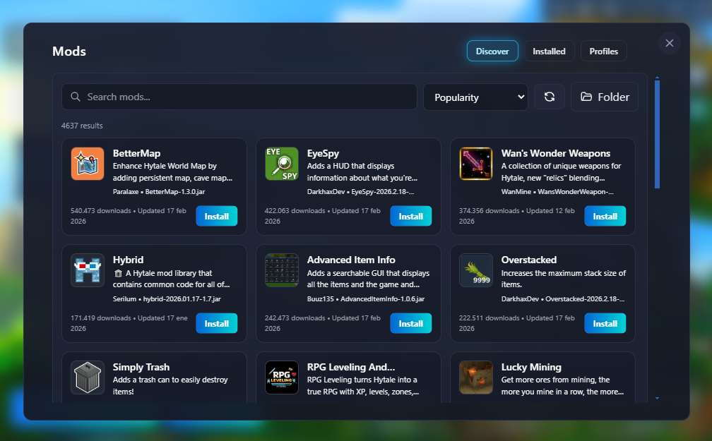 One-Click Install: Browse mods by popularity, relevance, or date. View images and install versions directly.