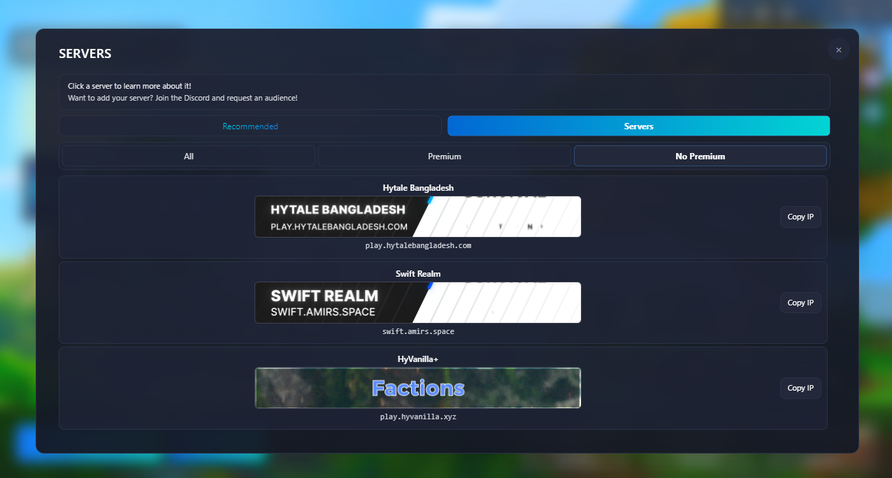 Server Browser: A curated list of servers, filterable by Premium and No-Premium support.