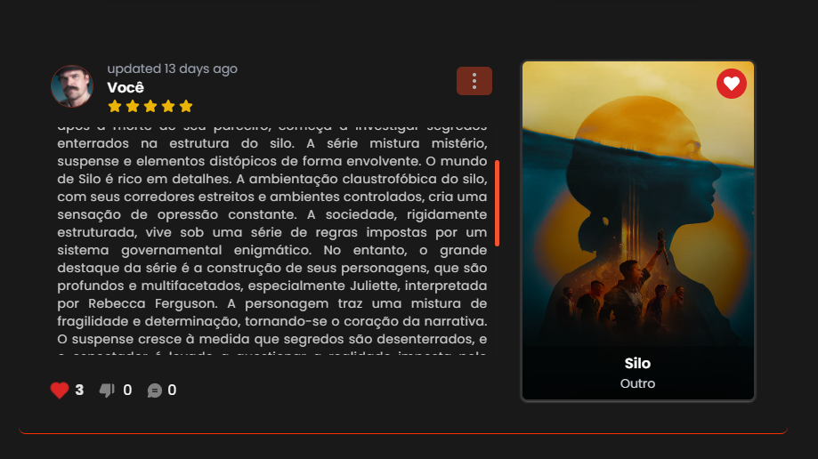 Autenticação JWTFeed dinâmico de avaliaçõesWatchlist personalizadaInteração via curtidas, comentários e compartilhamentosAnimações fluidas e transições elegantesResponsividade e acessibilidade