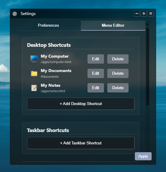 shortcuts.json: Defines the applications and their associated icons, which appear on the desktop, taskbar, and start menu. See the file for example format. The format is flexible, allowing for either a single array of shortcuts or separate arrays for each menu type under keys"desktop","taskbar", and"startMenu".settings.json: Contains customizable settings such as background image, theme, and font size. See the file for example format.