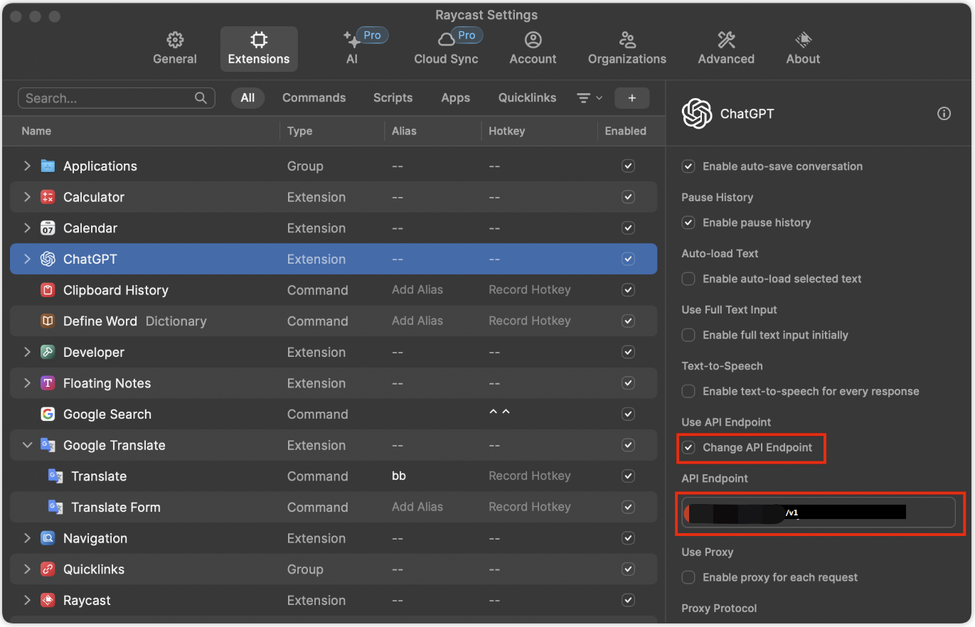 API Key中填入我们的API Key,以及选中Change API Endpoint,并在API Endpoint中填入https://api.whatai.cc/v1