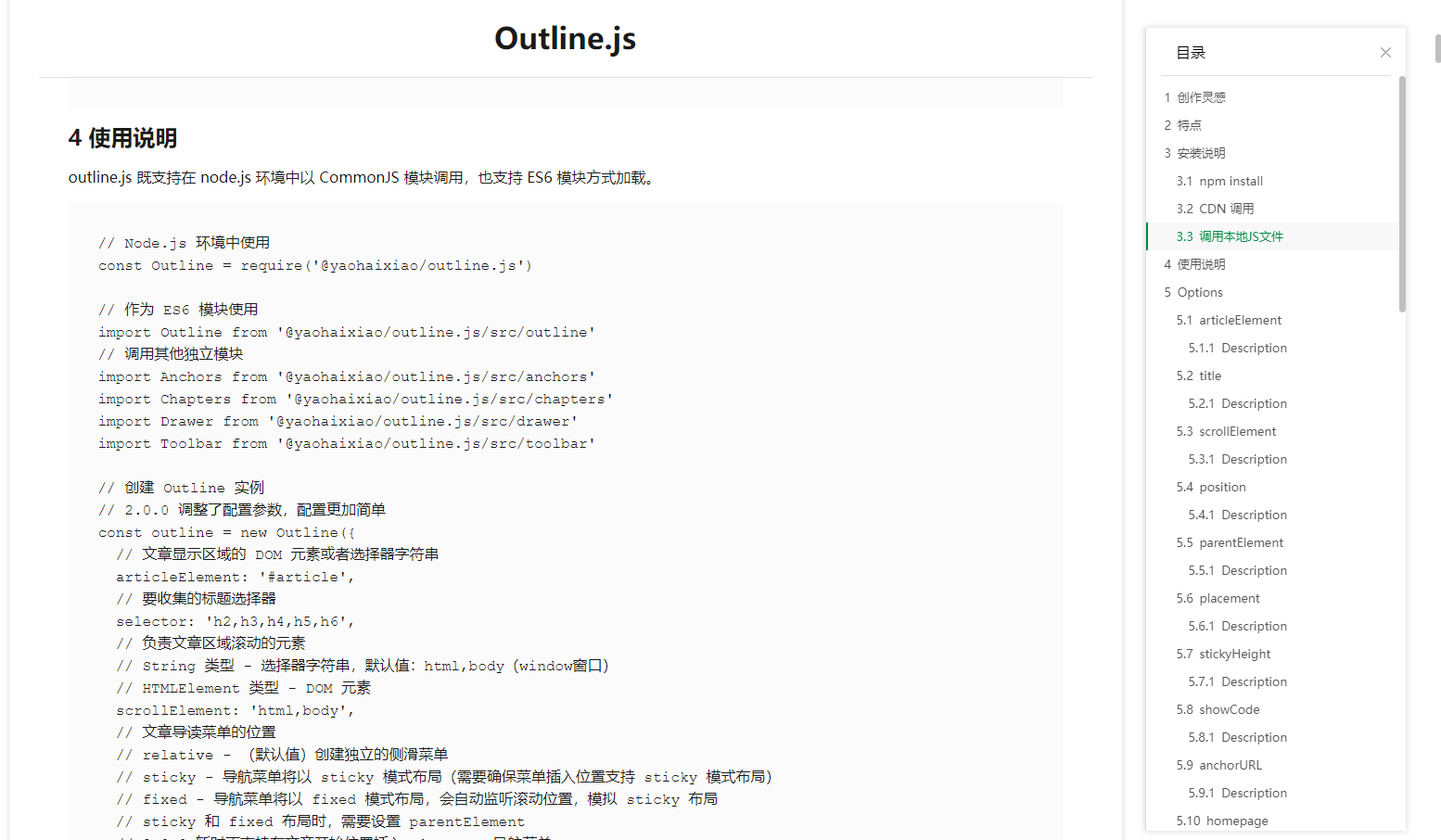 - fixed 定位(不显示按钮工具栏):https://yaohaixiao.github.io/outline.js/examples/fixed.html