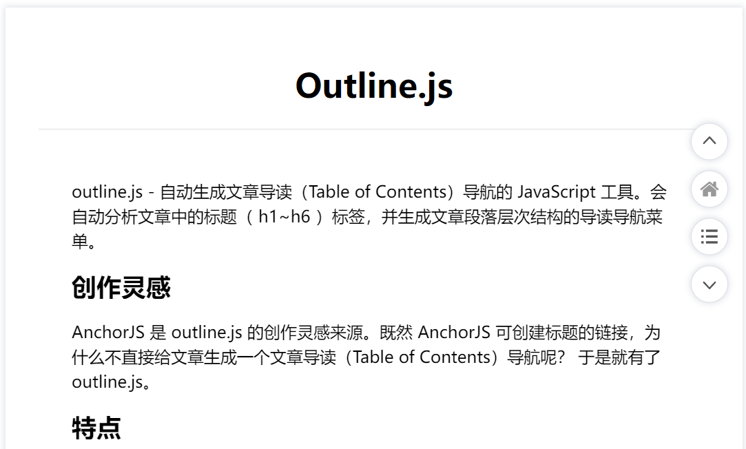AnchorJS 是 outline.js 的创作灵感来源。既然 AnchorJS 可创建标题的链接,为什么不直接给文章生成一个文章导读(Table of Contents)导航呢? 于是便有了 outline.js。